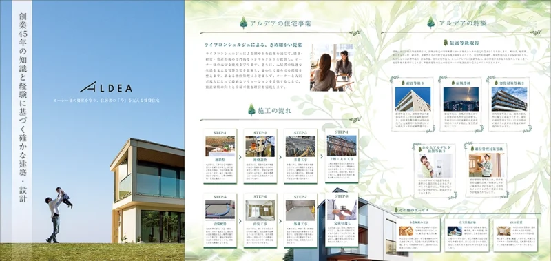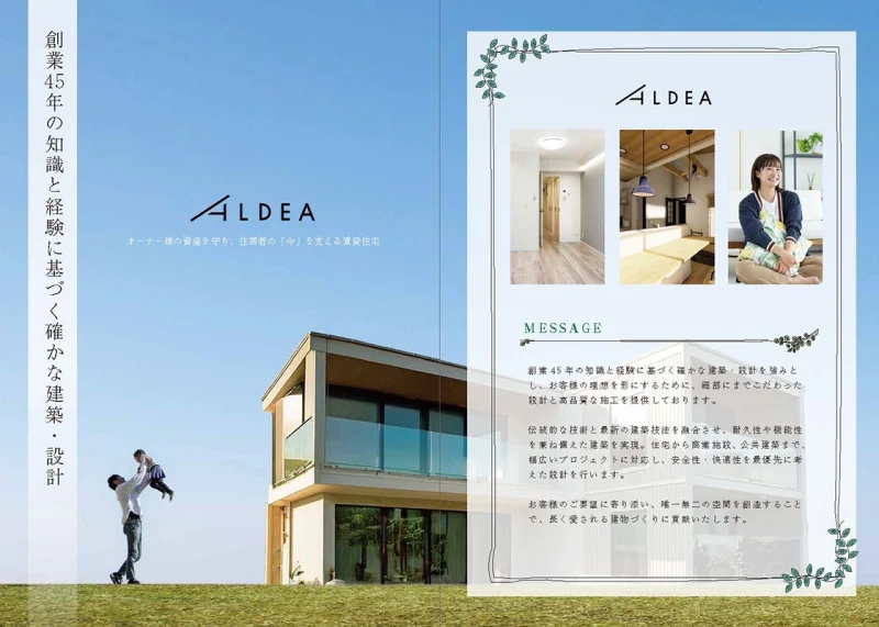 中村工務店様が展開する高品質賃貸住宅ブランド「ALDEA(アルデア)」の魅力を、わかりやすく丁寧に伝えるパンフレットを制作いたしました。
