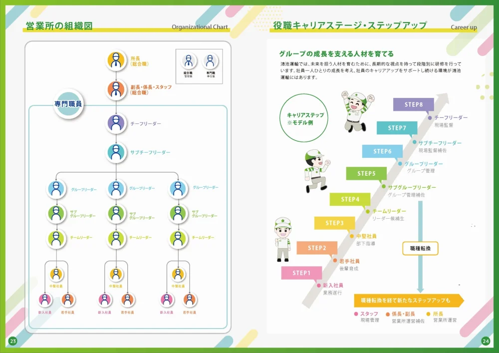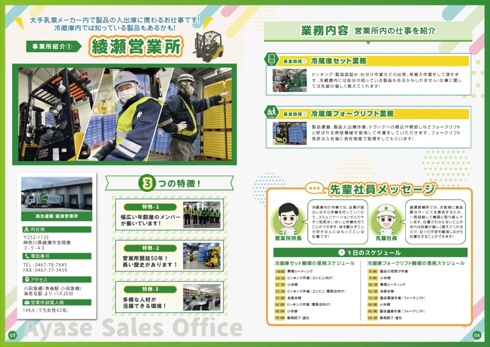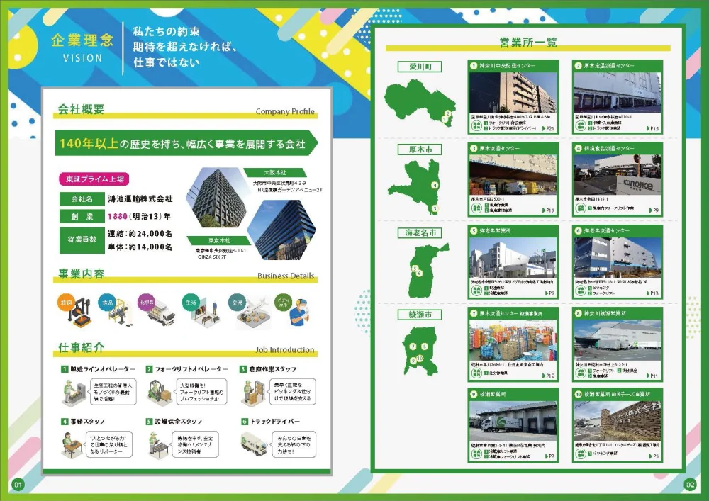 鴻池運輸グループ様の採用パンフレットの制作を担当させていただきました。 これから就職を検討する方に向けて、同グループで働く魅力をわかりやすく伝えることを目的に制作しています。表紙には、実際の現場で活躍する社員の皆さまやトラックの写真を使用し、リアルな仕事の空気感が伝わるよう工夫しました。 中面では、会社の歴史や事業内容を紹介するとともに、全国に展開する営業所を地図とともに掲載。情報を整理し、視覚的に見やすいレイアウトにすることで、初めて読む方でも理解しやすい構成にしています。また、具体的な業務内容や1日の流れ、先輩社員のコメントを掲載し、働く姿をより身近にイメージできる内容に仕上げました。全体のデザインは明るく親しみやすいトーンで統一し、就職活動の不安を少しでもやわらげ、「ここで働きたい」と思っていただけるよう心がけています。 パンフレットのデザインから印刷まで、一貫して対応させていただきました。 【仕上がりサイズ】A4サイズパンフレット 【ページ数】18ページ 【用 紙】コート110kg
